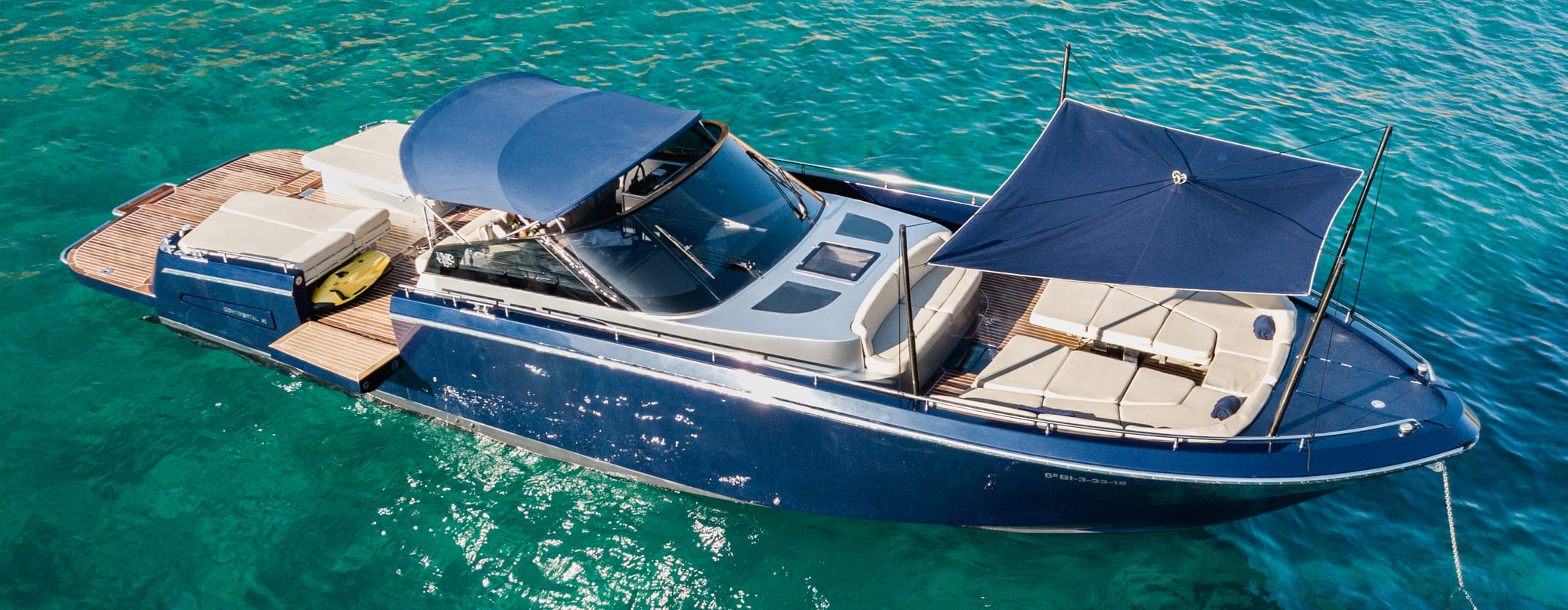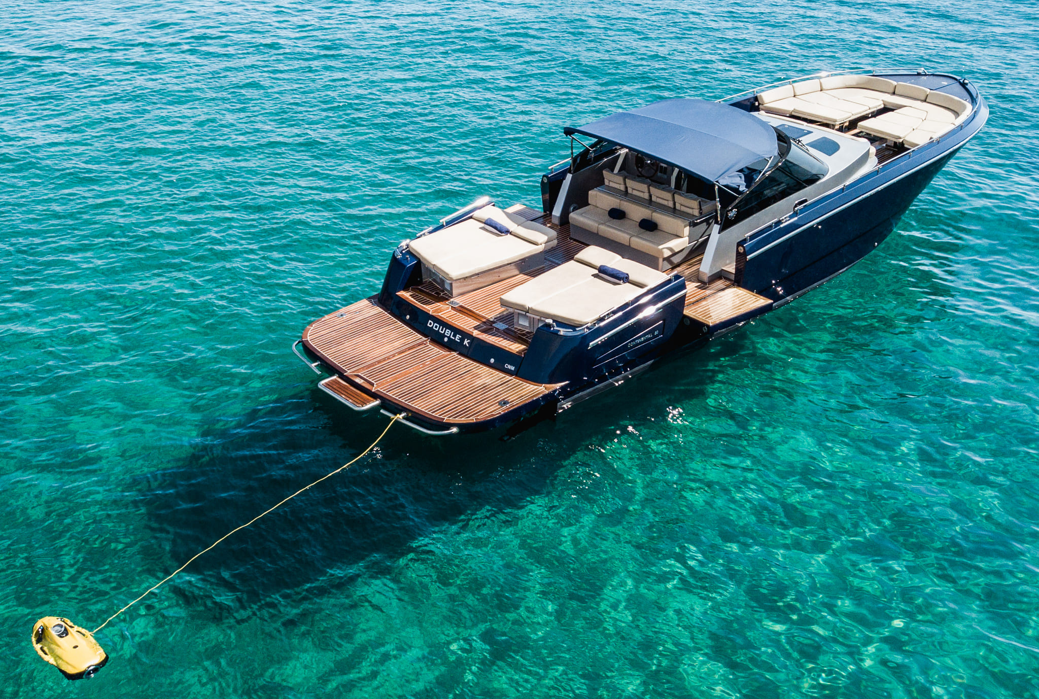 El Continental Tender 50 Double K és un autèntic icona del disseny mediterrani. Amb dos motors MAN de 800 CV, pot assolir una velocitat de creuer que et permet recórrer l’illa i arribar a Formentera en menys de 30 minuts. La seva distribució està pensada per gaudir del mar a l’exterior, amb un gran solàrium, sofàs modulars, bar complet i una estètica neta i exclusiva.