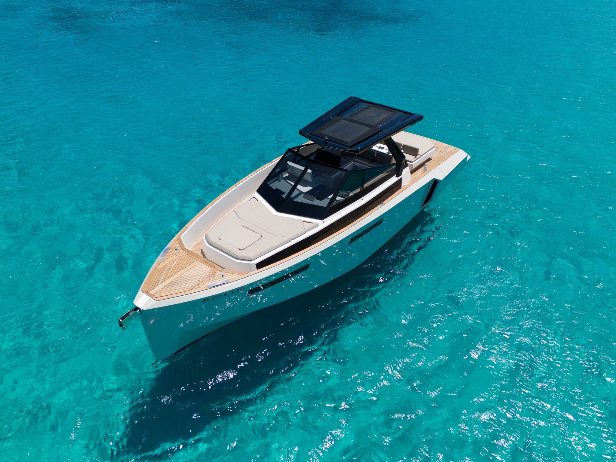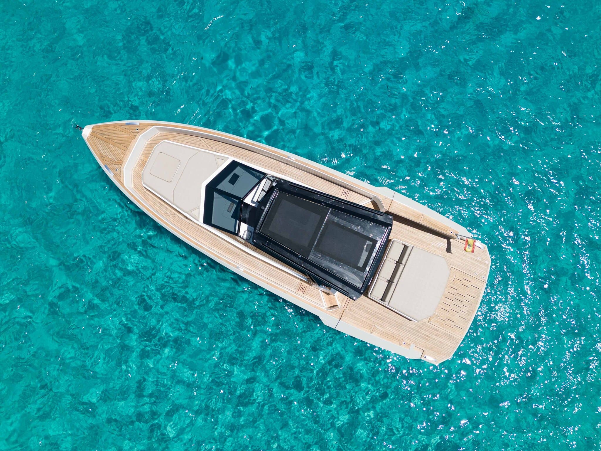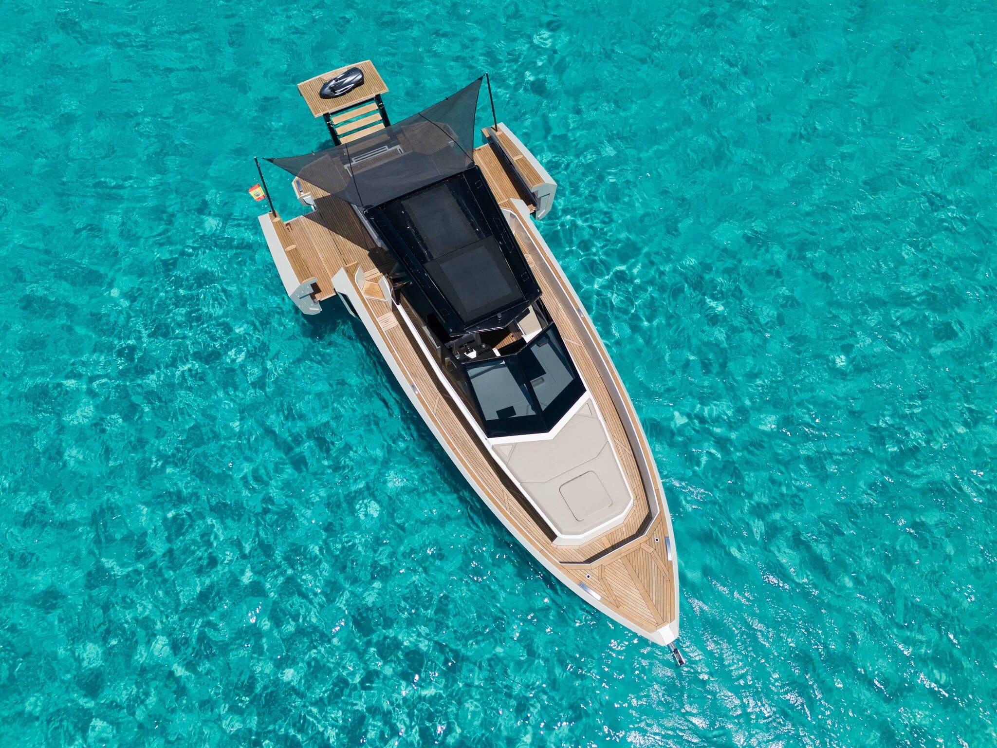 L’Evo R4 Aurora destaca per la seva estètica minimalista, una plataforma de popa hidràulica i una coberta versàtil que es transforma segons les necessitats: relaxar-se, prendre el sol o celebrar una festa. Amb dos motors Volvo Penta de 320 CV, garanteix una navegació suau, silenciosa i eficient al voltant de la costa pitiüssa.