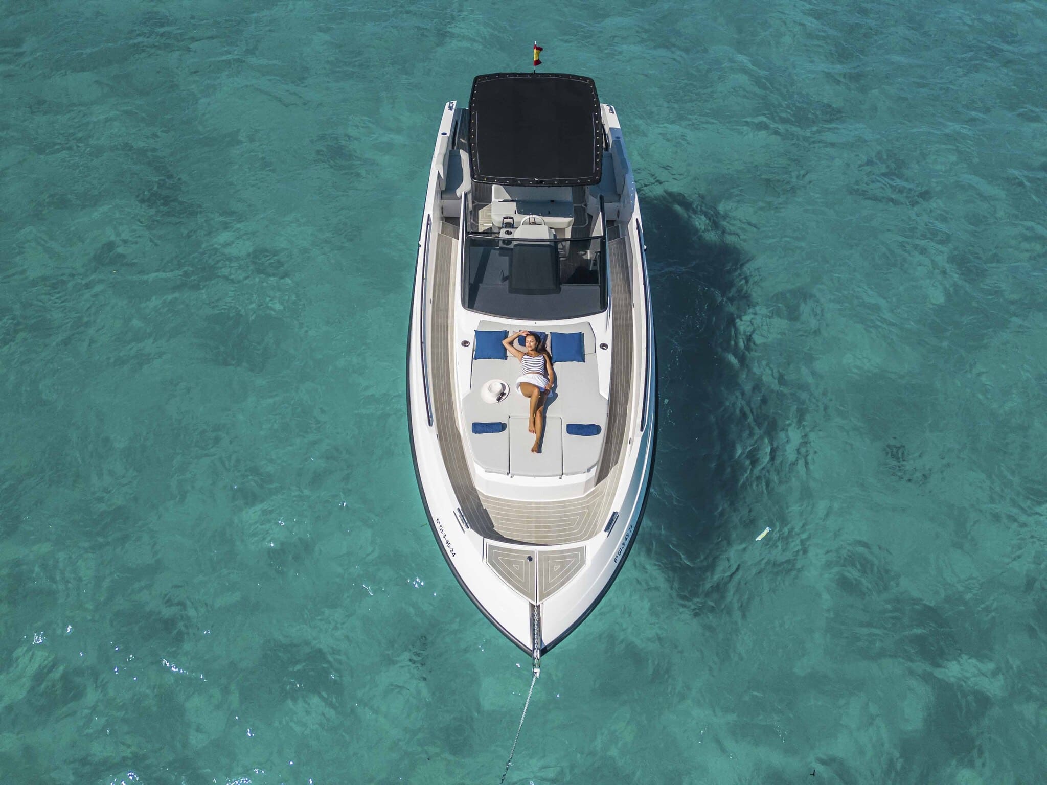 Ibiza Nautik hat dieses Boot mit leistungsstarken Motoren und effizientem Verbrauch ausgestattet. Damit ist es ideal für schnelle Fahrten zwischen Ibiza und Formentera. Wir empfehlen den Start in Marina Botafoch und einen Besuch von Buchten wie Cala d’Hort. Krönen Sie den Tag mit einem Mittagessen am Meer in Es Boldado.