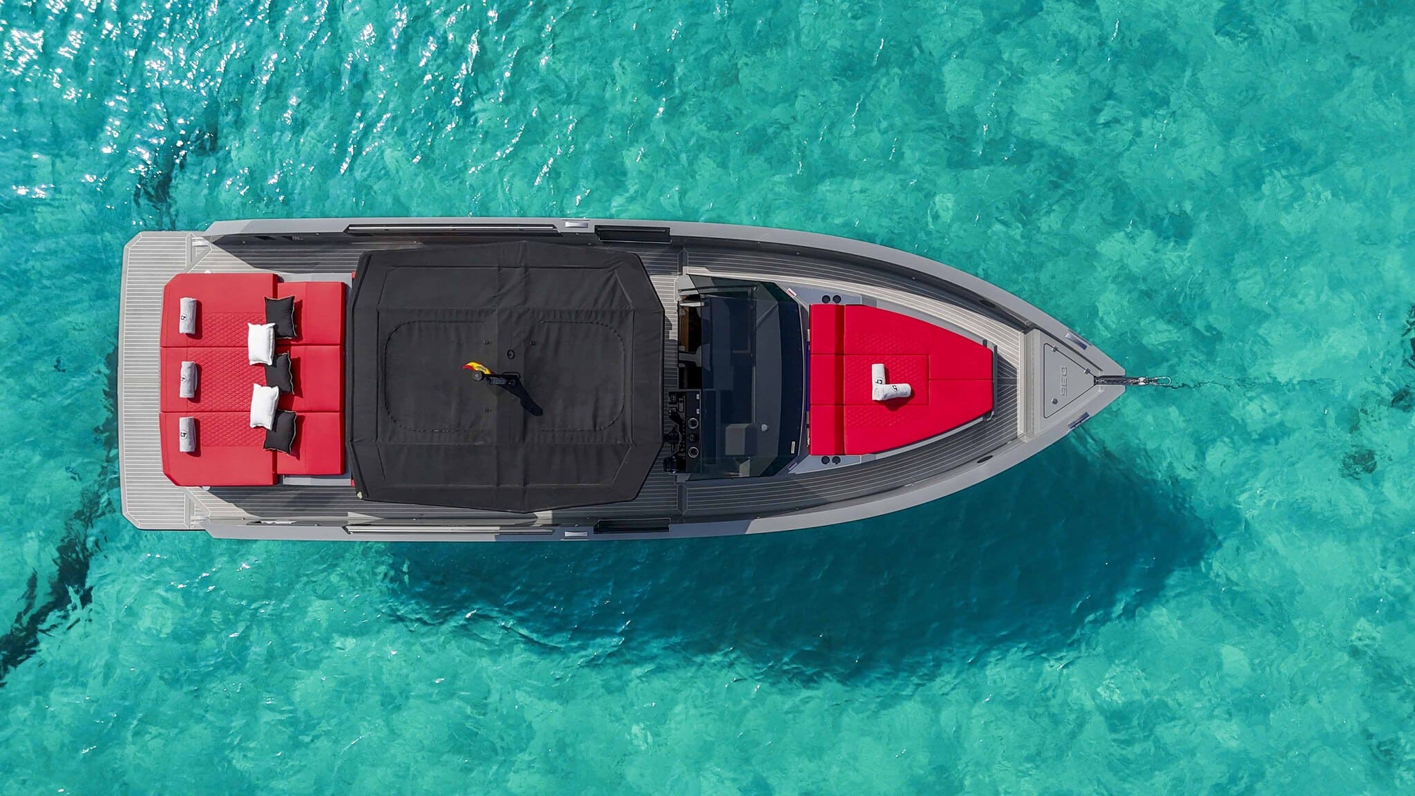 It features two 300 HP engines cleverly hidden beneath an extended platform, creating an unexpectedly spacious deck. With dual sunbeds, a central dining area, a double cabin with full bathroom, and a shaded lounge zone, the D36 is ideal for a group or romantic day at sea. It departs from Marina Botafoch.