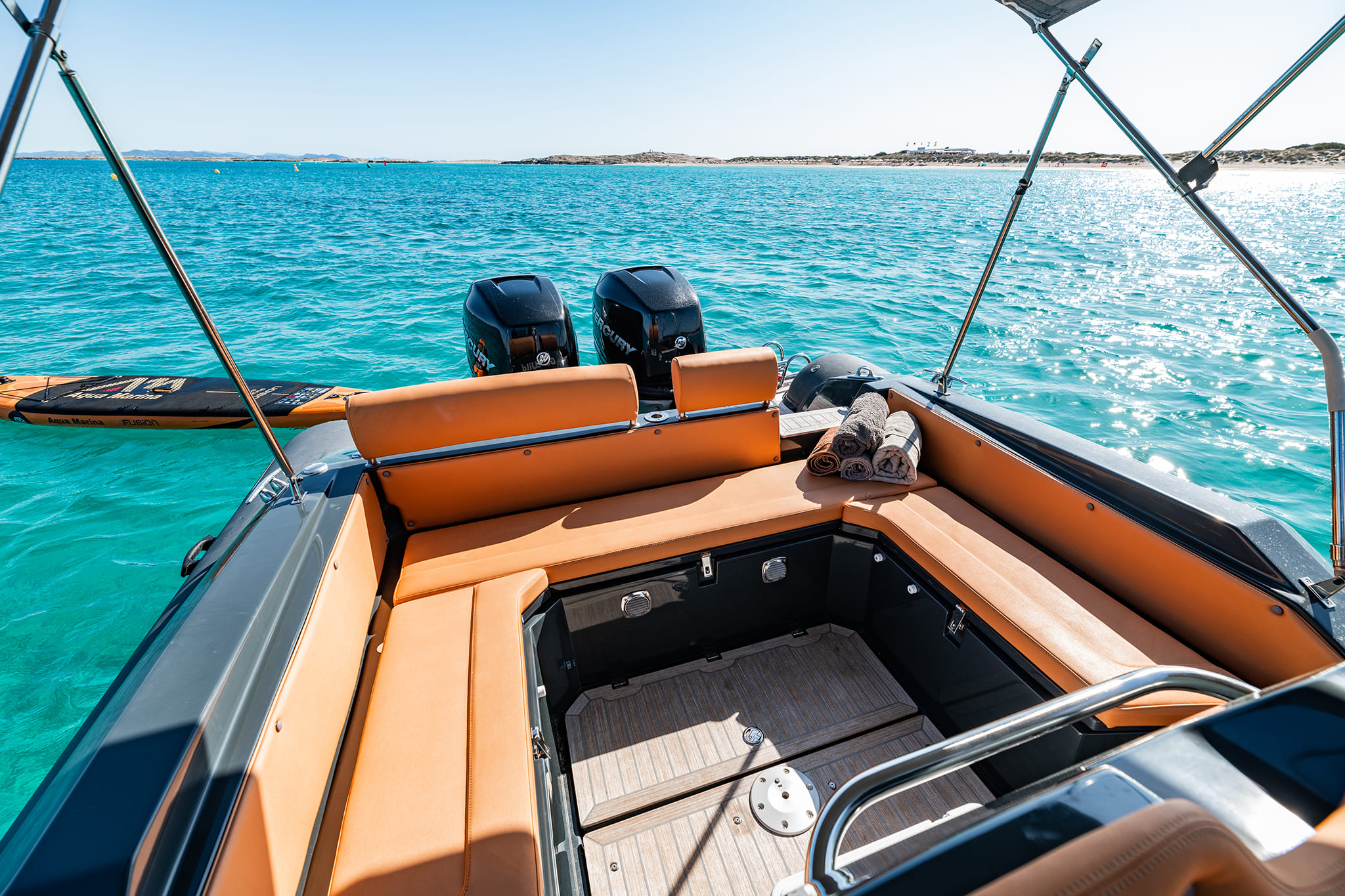 Choisir la location de ce bateau pneumatique à Ibiza vous permet d’accéder aux endroits les plus secrets. Son faible tirant d’eau est idéal pour approcher le sable des plages vierges.