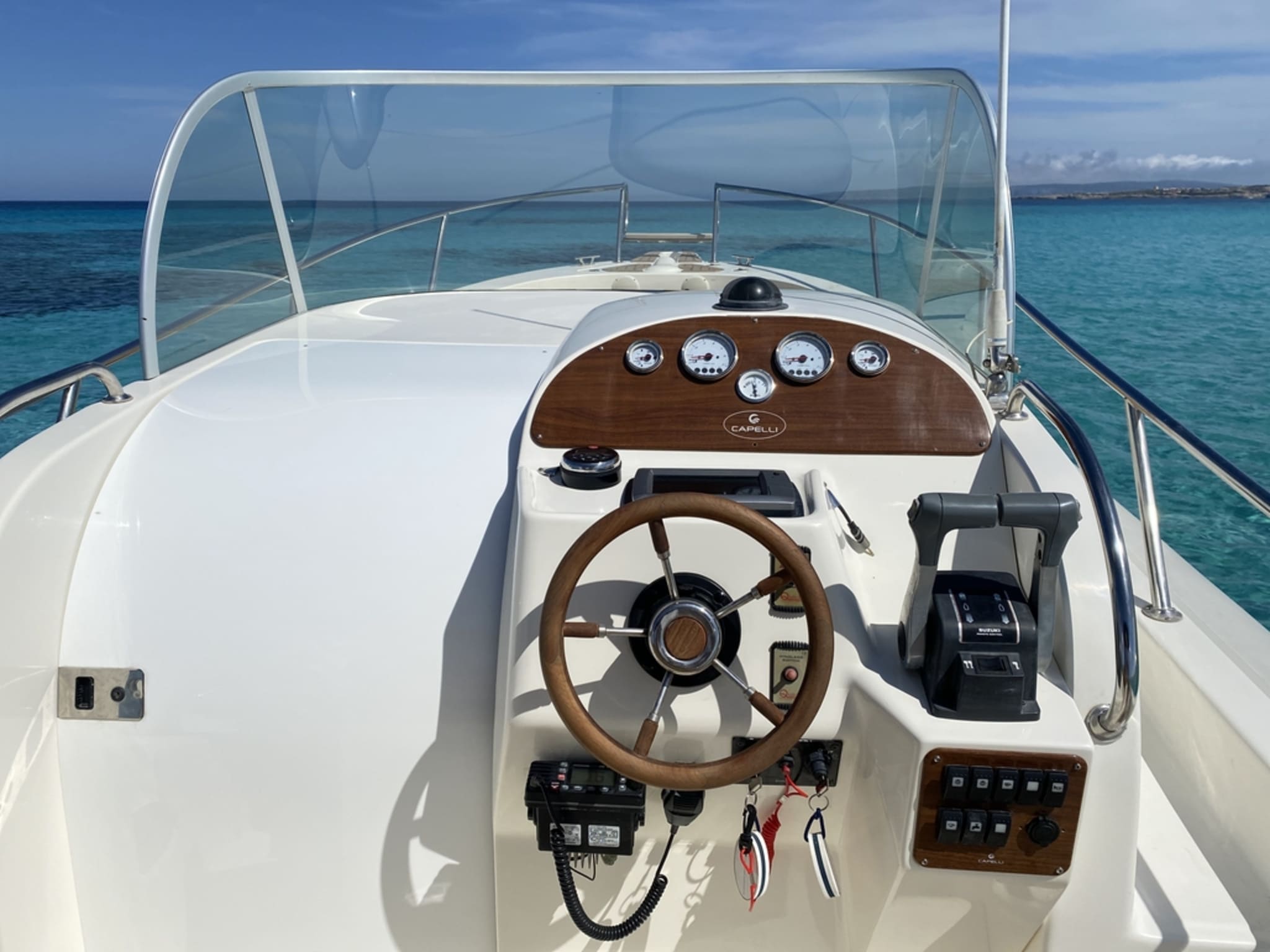Con 9 metros de eslora, motor Yamaha, solárium, toldo, ducha y sistema de sonido, esta semirrígida está pensada para el disfrute activo. Admite hasta 11 personas, ideal para grupos de amigos que quieren moverse con rapidez y estilo por las aguas de Ibiza. El diseño de la Capelli 900 permite una navegación ágil, con buena respuesta incluso en mar abierto. Su distribución optimiza el espacio a bordo, haciendo que cada rincón sea funcional.