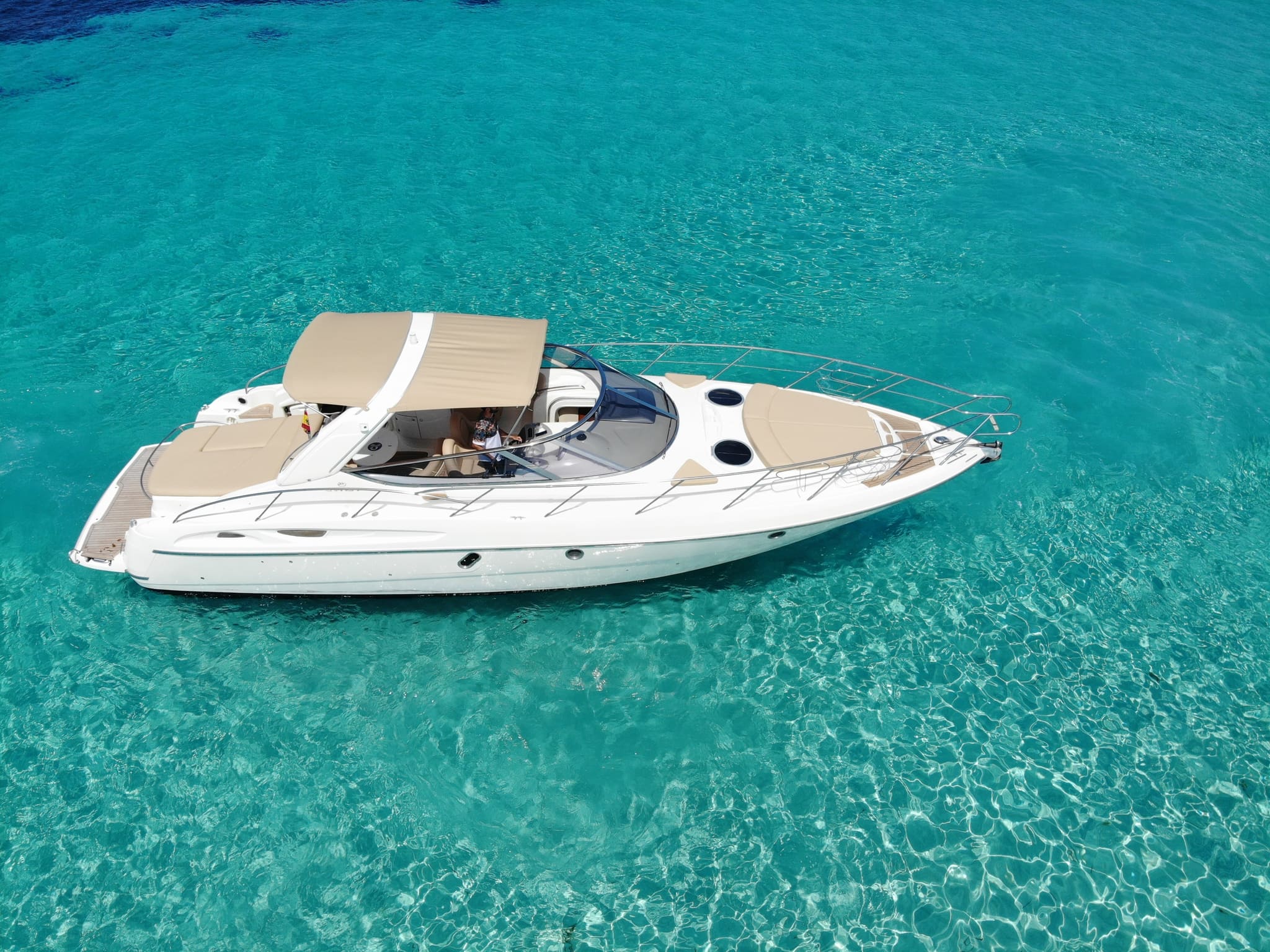 Al alquilar este barco en Ibiza, el Cranchi Endurance 41 Qbret te abre las puertas a rutas fascinantes. Puedes navegar hacia el oeste para ver la puesta de sol en Es Vedrà. O bien, poner rumbo a Formentera y fondear en las playas de Illetes. Durante tu travesía, te recomendamos una parada estratégica en Cala Jondal. Allí puedes desembarcar para almorzar en el vibrante Cala Duo, un lugar que combina sabor y exclusividad.