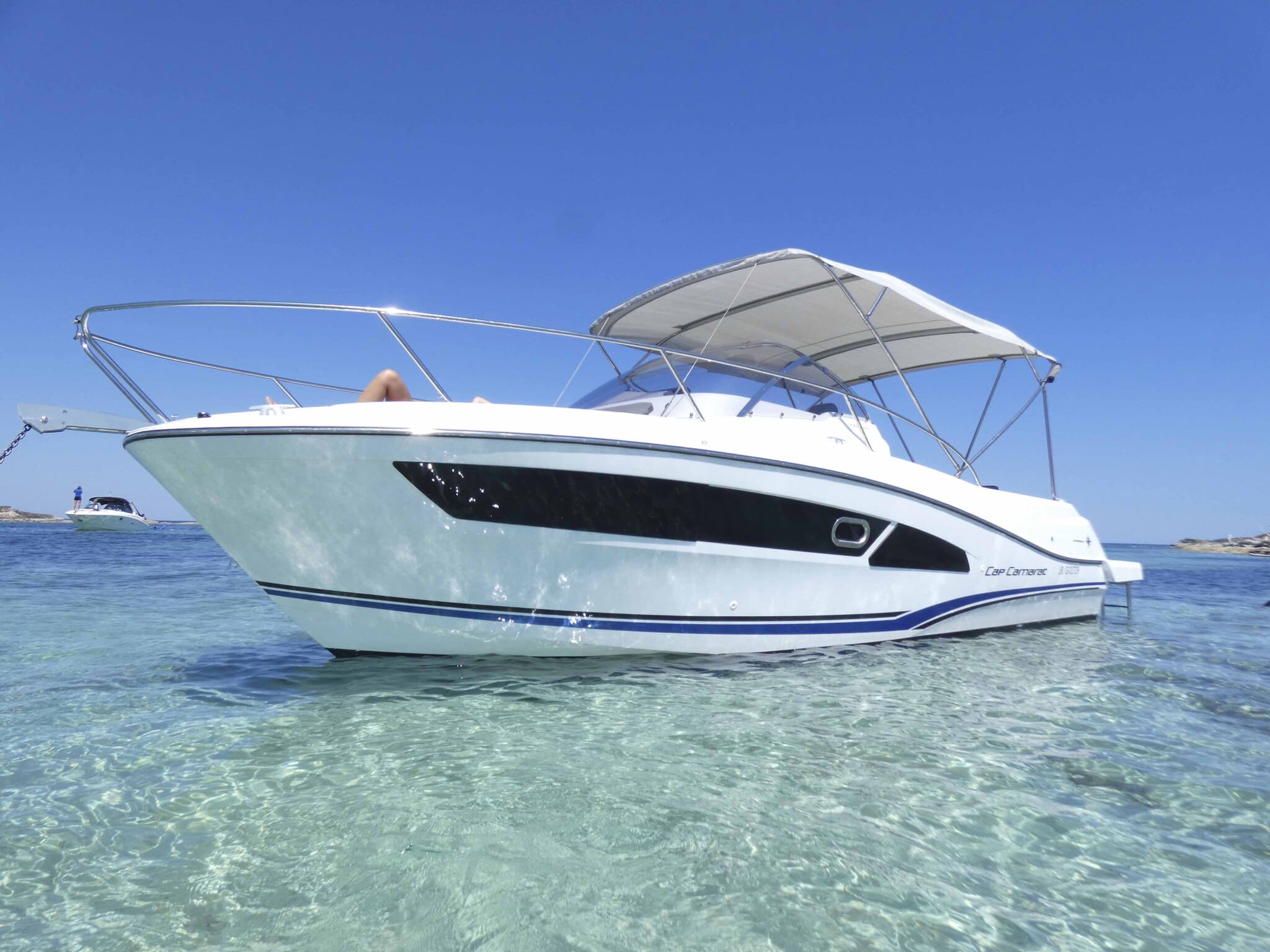 El Jeanneau Cap Camarat 9.0 Thymar destaca por su amplio espacio y su gran capacidad de adaptación a diferentes tipos de salidas. Su diseño permite tanto disfrutar de un día de relax en el mar como explorar calas escondidas con total libertad. Dispone de un espacioso solárium en proa, una bañera cómoda con zona de comedor y una cabina con todo lo necesario para el descanso.