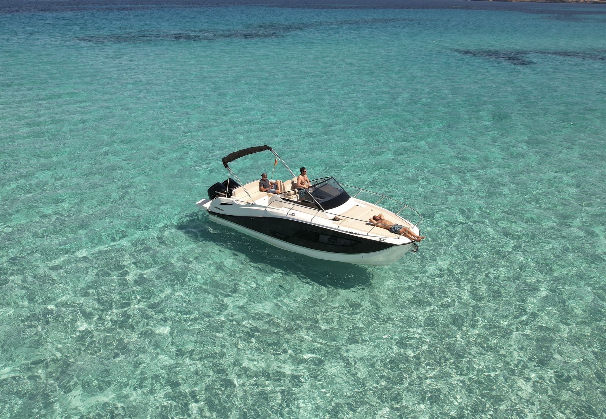 Si deseas alquilar lancha en Ibiza, la Quicksilver Activ 875 Sundeck Luz es ideal para quienes valoran amplitud, potencia y confort. Ofrece espacio para 12 personas y permite dormir a bordo hasta 4, perfecta para días enteros en el mar o escapadas cortas.
